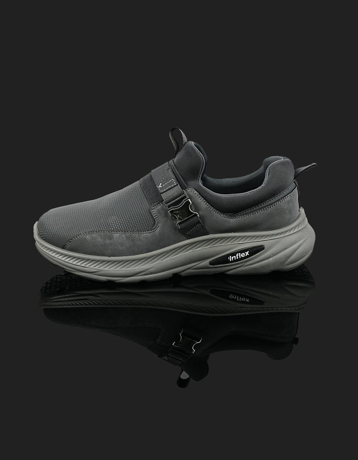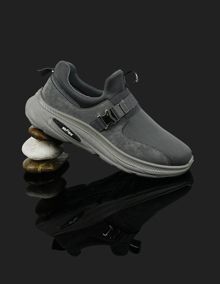 The K-812 Dark Grey Slip-On Sports Shoes deliver modern style with ultimate comfort. Featuring a breathable mesh upper, padded lining, and supportive sole, these shoes are designed for all-day wear. The metallic side buckle adds a fashionable edge to your sporty look.