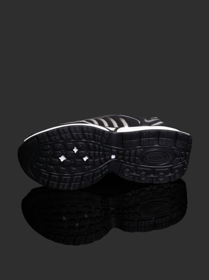 Classic Structure: The upper features a durable black mesh base for breathability, reinforced by synthetic leather overlays with eye-catching gray striped details that give it a distinctive, speed-focused look.